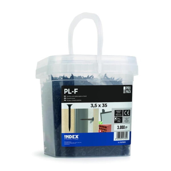 Tornillo para placa de yeso de altas prestaciones. Fosfatado. Cabeza trompeta, rosca doble hilo y punta alfiler. Huella PH – Bote de plástico. Medida : 3,5 x 25